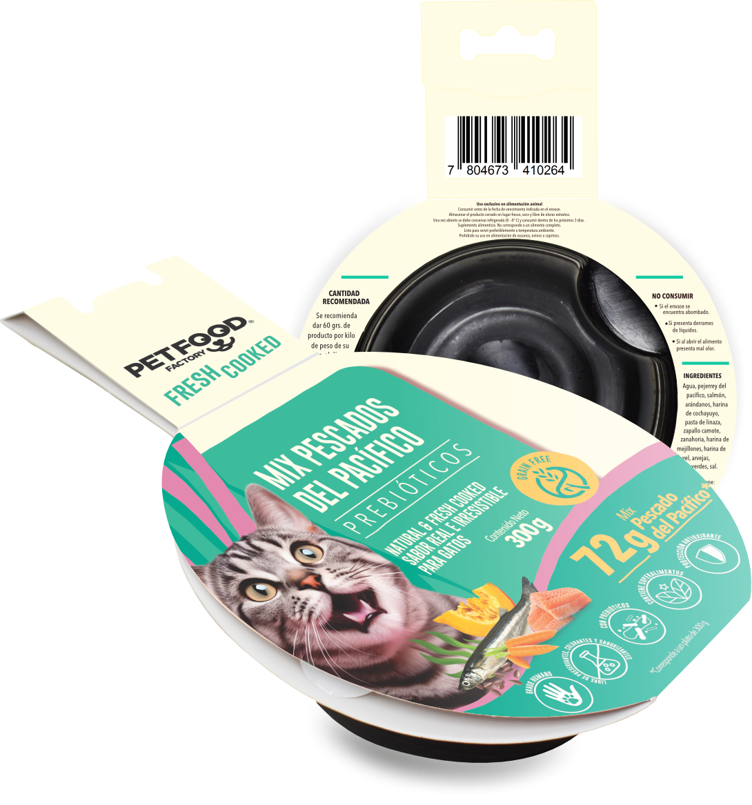 Pet Food Factory Pate Marino Pescados Del Pacifico es una alimento húmedo para gatos en forma de paté formulado con pescados del pacifico, prebióticos y omega-3 para una piel sana y pelaje suave saludable y brillante. Formulado con ingredientes de grado humano. Libre de colorantes, conservantes y saborizantes. Listo para consumir